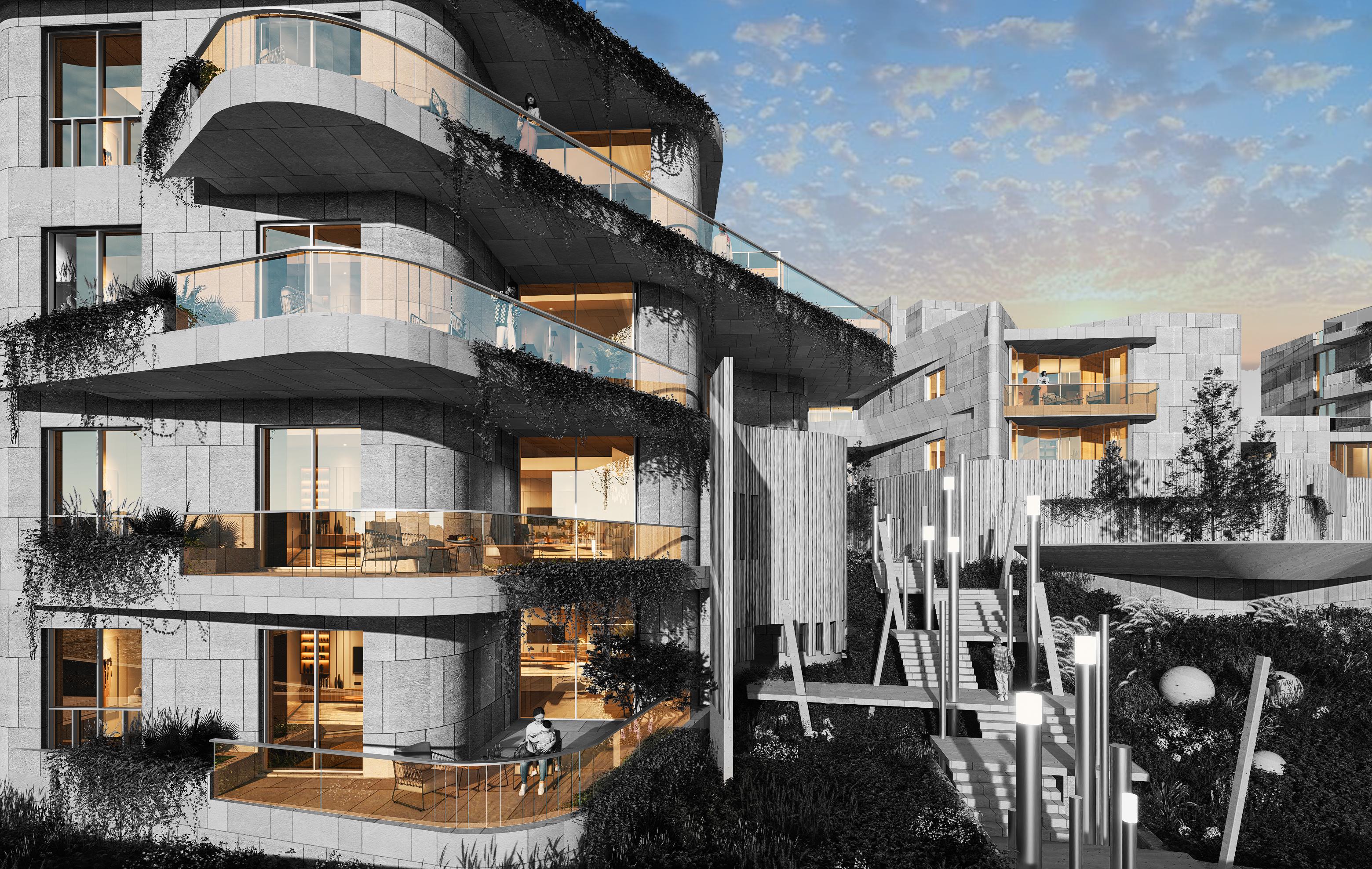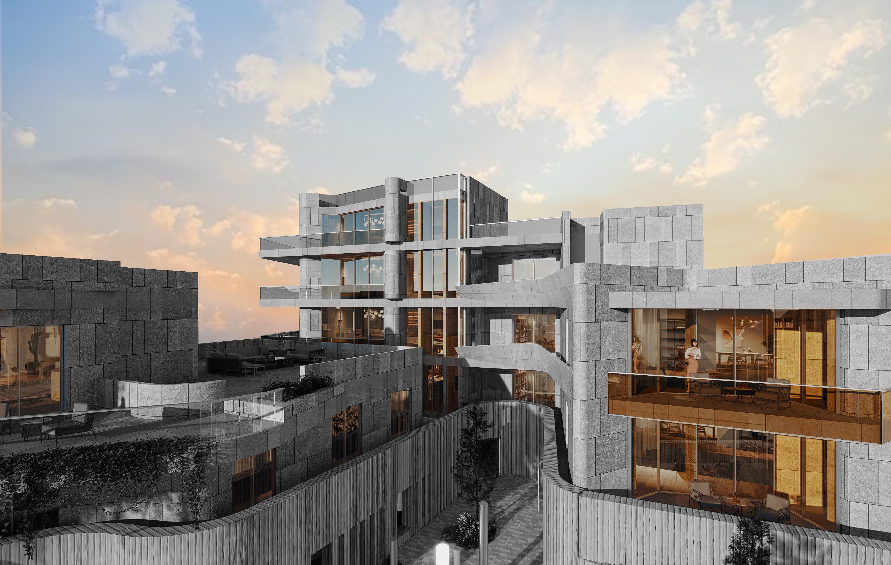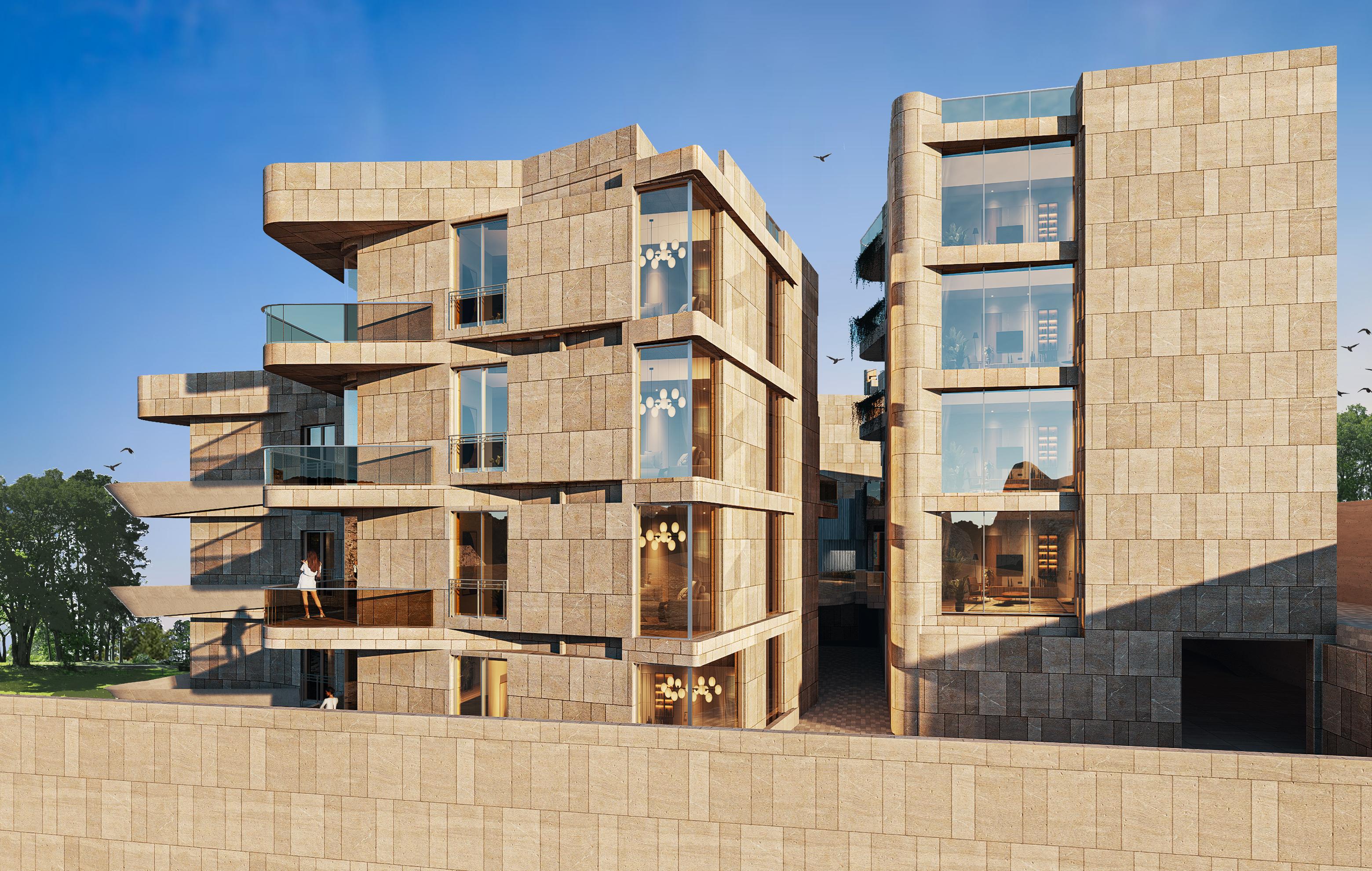 This Residential Complex embodies an advanced architectural vision,  seamlessly integrating building masses with the natural terrain to create a harmonious connection between structures and outdoor spaces. The façades combine rock-faced natural stone, which emphasizes solidity and depth, with honed natural stone that introduces visual softness and architectural balance.